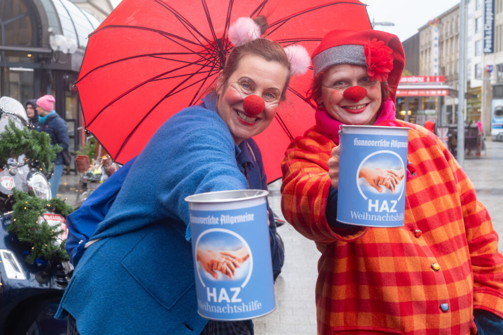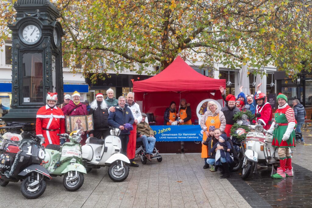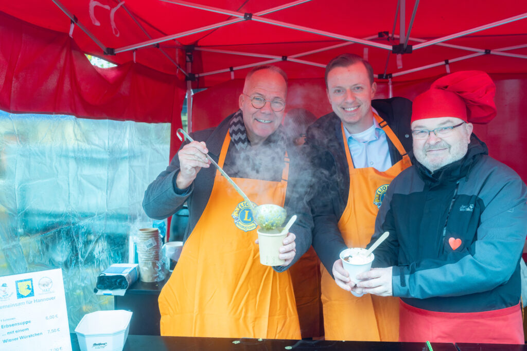 Auch in diesem Jahr hatten die Lions wieder prominente Unterstützung: Oberbürgermeister Belit Onay (Grüne) kümmerte sich um die Suppe, und Bürgermeister Thomas Hermann (SPD) – schon das zwölfte Mal dabei – wendete entsprechend gekonnt Pilze in der Pfanne. Auch Stadtsuperintendent Rainer Müller-Brandes, die Clinic-Clowns Barbalotta und Frieda sowie die Mitglieder des Vespa-Clubs Hannover (samt Heiligem Vesparus), Elfen und diverse Weihnachtsmänner halfen beim Benefiz-Angebot. „Ich kenne Herrn Ahlers schon lange und schätze das Engagement sehr“, sagte der Chef der SPD-Bundestagsfraktion, Matthias Miersch. Zusammen mit dem SPD-Bundestagsabgeordneten Adis Ahmetovic war er ebenfalls zur Aktion für die HAZ-Weihnachtshilfe gekommen, um Suppe zu verkaufen.